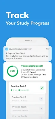Keep track of your progress through the chapters and lessons. Keep track of your test scores and average time. Easily pick up where you left off with the Continue Studying shortcut.