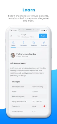We have created a tool for effective learning and validating your medical knowledge. Thanks to our application, you can take your medical training to the next level and improve it at any time whenever you are. Improve your skills through solving interesting medical cases from various fields of medicine. Face authentic diagnostic challenges, diagnose a patient, perform a physical examination and measure yourself against other users!